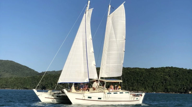 O veleiro encontra-se em Paraty, na bela baía da Ilha Grande, lugar de praias paradisíacas e ilhas desertas.